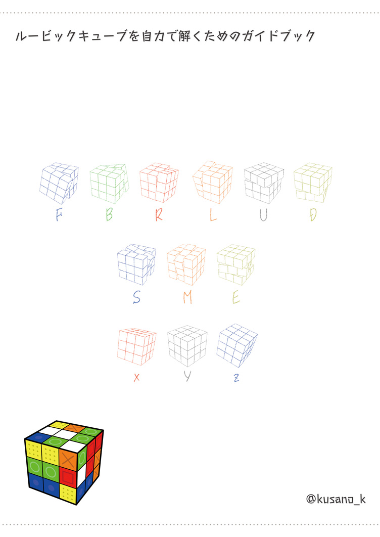 ルービックキューブに興味を持って購入した後、まずは解法を調べて、それを覚えようとする人が多いのではないかと思います。 ルービックキューブもパズルなのだから、答えを見ずに自力で解いてみませんか? という本です。 前半ではおおまかな方針のみを示し、後半ではその方針に沿って解いた例を載せています。 また、コミュテーターというルービックキューブのような回転パズル全般を解くのに使える手法も解説しています。 すでにルービックキューブの解法は知っているが、解くときの手順がどのようにして出てきたのかが気になるという人にもお勧めです。